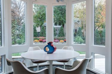 Informal meals are served in a sunny bay, an exact duplicate of the casual dining area in the owners’ previous home and furnished with an original Saarinen dining ensemble. The alcove’s full-height windows overlook a beautifully terraced yard, designed by landscape architect Matt Moynihan and filled with seasonal color by Baxter Gardens.