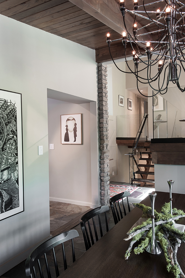 Thoroughly masculine, the master bedroom features a Gus* Modern bed, flanked by vintage night tables and Tolomeo wall lights. Adding a splash of color are two favorite artworks – above the headboard, a bold abstract that had hung in Balaban’s Central West End location for years, and on a side wall, an abstract painting by local artist Julie Malone.