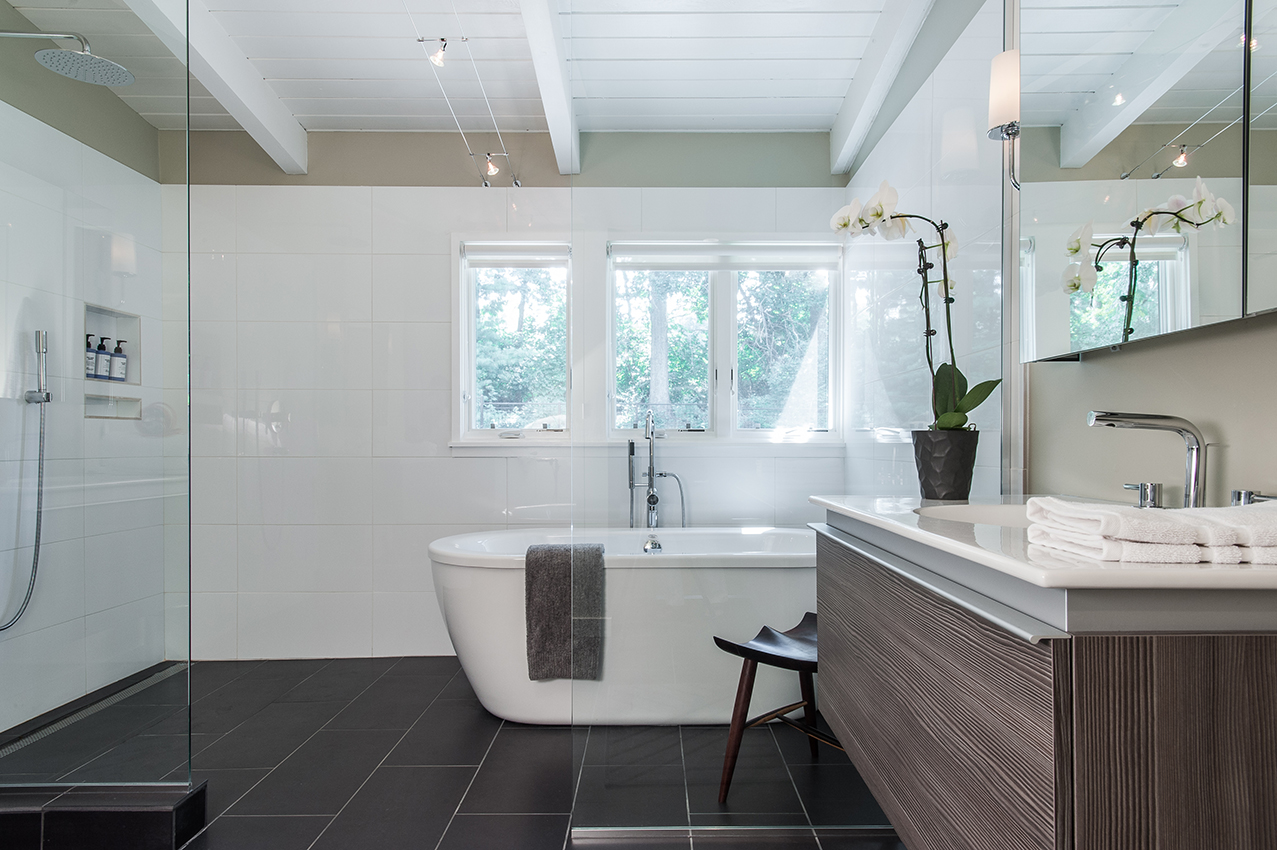 A hall leads from the living room to the privacy wing, which houses the master retreat and two additional bedrooms. Adapting the master suite to today’s lifestyle, Michael converted an auxiliary bathroom to a sizable walk-in closet and transformed a former bedroom into a luxurious master bath, with heated floor, 12” x 24” high-gloss wall tiles, two Duravit vanities, Grohe fixtures, a free-standing tub and a curbless rain shower.