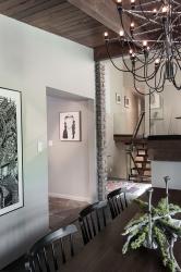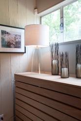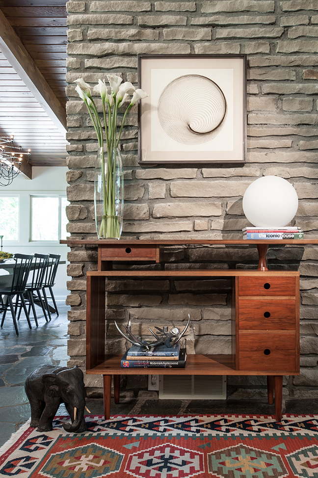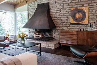 Consistent with the period, the room is comfortably furnished with a neutral-toned sofa, side chair and area rug from Niche; a Herman Miller Eames chair and ottoman (a “birthday present” from the owner to himself); a streamlined steel coffee table from Portland, and a vintage console cabinet found at a local antique store.