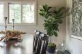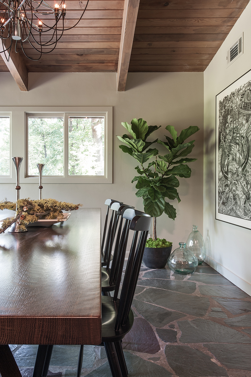 To the right of the foyer, the dining room has its original slate floor and tongue-and-groove ceiling, and the fumed white-oak table is complemented by clean-lined salt chairs from Design Within Reach. Accessible from the dining area, the kitchen is typical of its era and eventually will be the owner’s next renovation project.