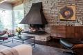 Upstairs, the living room is the epitome of mid-century styling, from its beamed, tongue-and-groove ceiling to the walls of windows overlooking the densely wooded 1.5-acre property. The space is dominated by its original fireplace, a signature element in Harris Armstrong homes. Cut stone blankets the raised hearth and background wall, and a massive hood reaches nearly to the ceiling.