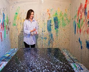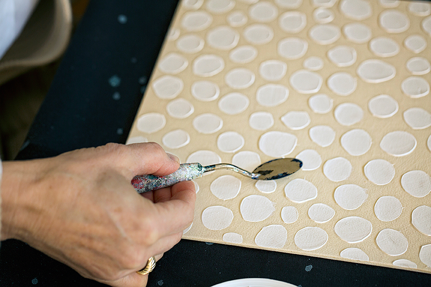 Each painting is built on this inventive foundation. “While I had learned more traditional ways of using paint, it was being able to play with the properties and see what it would do,” says Amy. Playing with a palette knife and acrylic paint, she finds depth through texture. With just a brush, she discovers impressive forms and lines that create texture from movement. Her self-created “squirt gun method” incorporates different angles to create different paint splatter shapes.