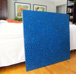 Her father, the civil engineer, taught her the importance of structure in design, and the patience to carry out ideas into finished projects. Her compositions are constructed with the background of the pieces' proprietor in mind, such as a past abstract painting comprised of 10 loops representing the couple’s 10-year anniversary and three circles for the number of children. Looking at the design process through problem solving, she is able to brainstorm a final product from a patron’s story and ideas about location, color and mood.