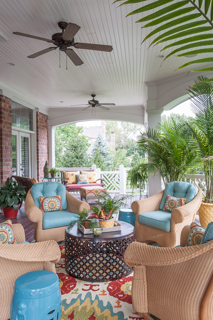 Fully visible from the hearth room and casual dining area is a fabulous covered veranda, where the color scheme was modified somewhat, transitioning to gold, turquoise and deep coral for a more “tropical” effect. Two benches, covered in an embroidered indoor/outdoor fabric, and a vivid all-weather rug establish the tricolor theme. Comfy wicker chairs, cushioned in turquoise, are grouped around a steel-mesh coffee table, and three separate dining arrangements provide seating for two, four or six. Bright-yellow planters, turquoise garden stools and throw pillows made by Karen lend colorful accents.