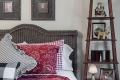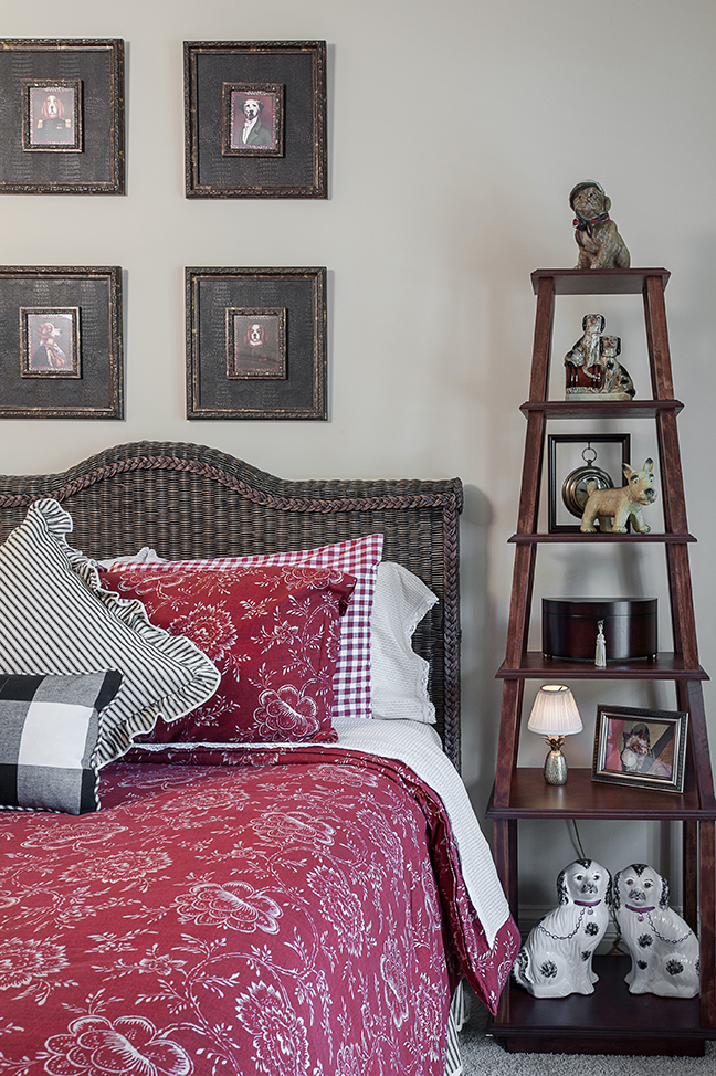 For example, the whimsical “dog room” illustrates the family’s love for animals, particularly their favorite pet Yorkshire Terriers. Amusing dog “portraits” top the wicker headboard, and a Ballard Design étagère showcases additional canine objets d’art. Maintaining a sense of decorum, however, the bedding is a traditional Ralph Lauren design in a deep-red cotton floral.