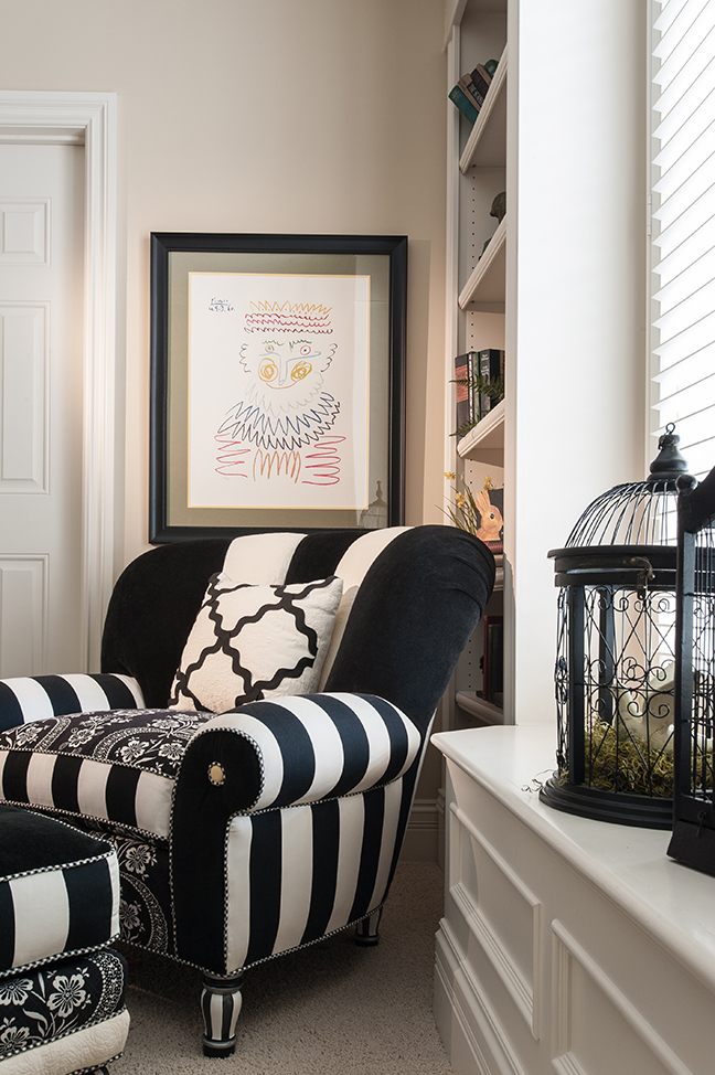 Displayed in this room and throughout the home is a varied collection of original paintings. “Jim is an art lover and travels a lot on business,” Karen notes. “We enjoy visiting art fairs, and he’s brought back pieces from around the world, places like Bangkok and South America.”