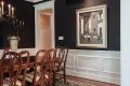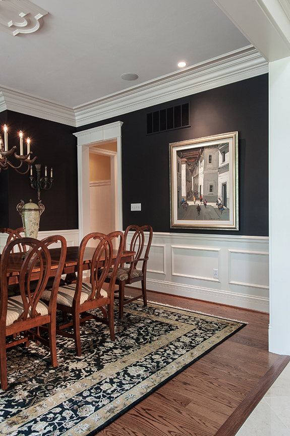 In the dining room, stark-black walls contrast dramatically with the all-white woodwork and picture-frame chair rail. “This was an ‘experiment’ that Kathleen talked me into,” says Karen, “and I really like it, since it makes a nice transition from the black-and-white kitchen.” Set on a richly hued floral rug are a Thomasville inlaid-mahogany dining table and mahogany chairs upholstered by Karen – the host/hostess chairs in an elegant paisley, the side chairs in a complementary ribbed plaid.