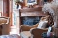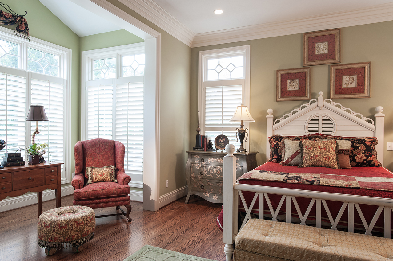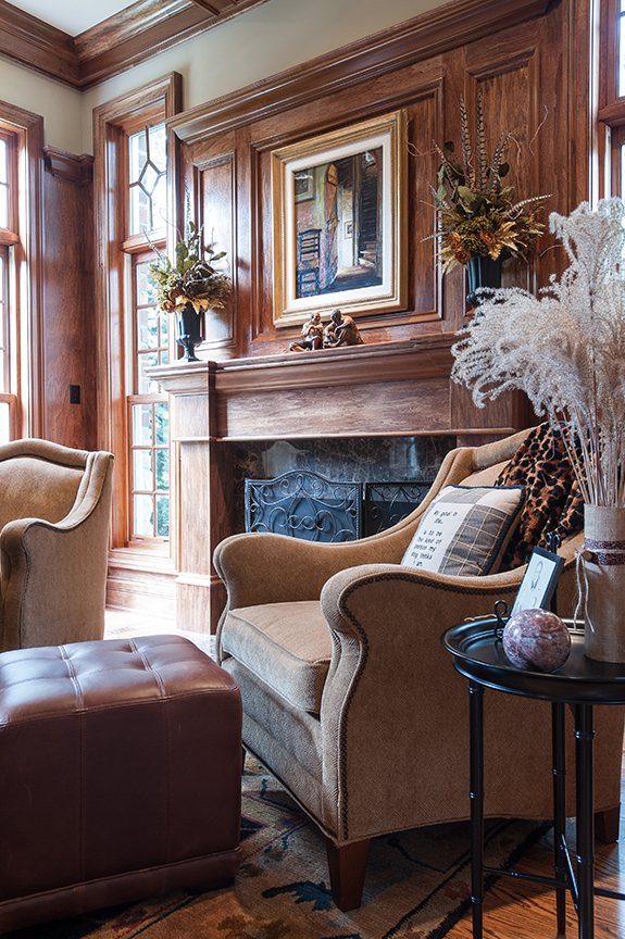 Characterized by elaborate woodwork, high ceilings and expansive windows, the home’s main level flows smoothly from one space to another and is well suited to entertaining. The red/green/gold theme first was established in the hearth room and, although Karen had no particular style in mind when starting the process, she describes the ultimate décor as “eclectic and kind of Country French.”