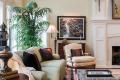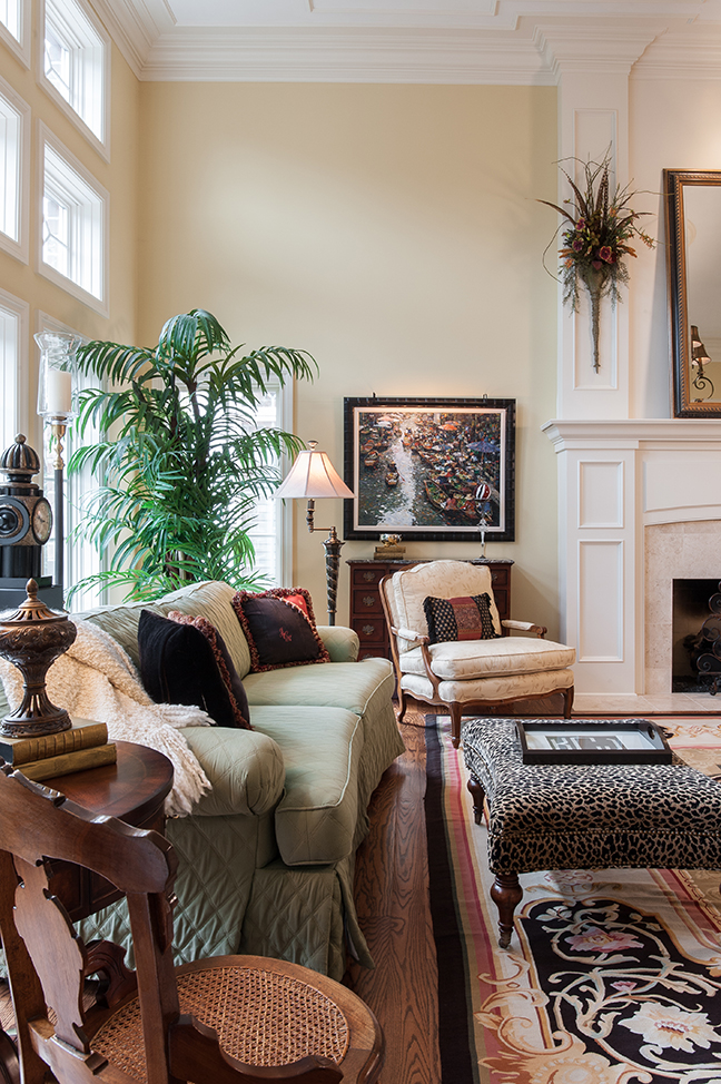 Awash with color and natural light, the two-story living room is comfortably furnished with a pair of soft fern-green sofas, preowned but relatively new when brought to this house; two French-style side chairs in a pale-gold damask; an eye-catching leopard-print ottoman and tray coffee table, both from KDR, and two additional side chairs, upholstered by Struckhoff in a red/green/gold stripe that reinforces the palette. The hand-woven and embroidered living room rug was a special find and exactly what Karen was looking for, with its French-influenced medallion design and complementary hues.