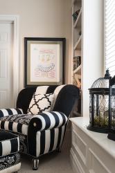 In the dining room, stark-black walls contrast dramatically with the all-white woodwork and picture-frame chair rail. “This was an ‘experiment’ that Kathleen talked me into,” says Karen, “and I really like it, since it makes a nice transition from the black-and-white kitchen.”  Set on a richly hued floral rug are a Thomasville inlaid-mahogany dining table and mahogany chairs upholstered by Karen – the host/hostess chairs in an elegant paisley, the side chairs in a complementary ribbed plaid.