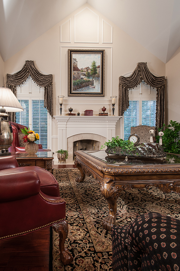 The great room was home to two chairs the homeowners just loved. Instead of replacing with something new, Gigi suggested they reupholster the pieces in a red leather hide. “Because of their scale and shape they really worked in the space,” Lombrano explains. To complement the existing chairs, a new sofa was ordered and the mantel was given a facelift with new accessories. “We really relied on Gigi for a vision for our mantels,” Vicki explains. “The size and scale were really important, and we held out until we found the perfect hurricanes.”