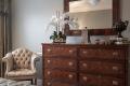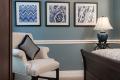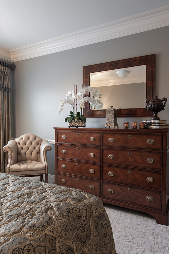On the second level, two guest bedrooms were given a refreshing facelift with paint, new bedding and accessories. In the “blue room” Vicki fell in love with the artwork she found online. After ordering one print and deciding it was a go, she purchased the entire set to frame on the wall. Double crown moulding and chair rail spruced up the “gray room.” The homeowners also purchased new furniture by Henredon. The collection is classic traditional, but the furniture is not overly carved or ornate giving the space a neo-traditional look.