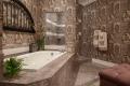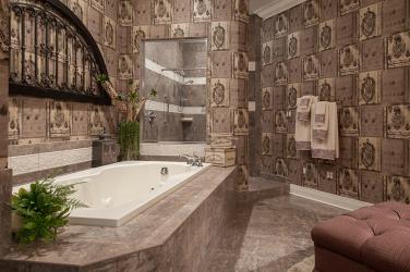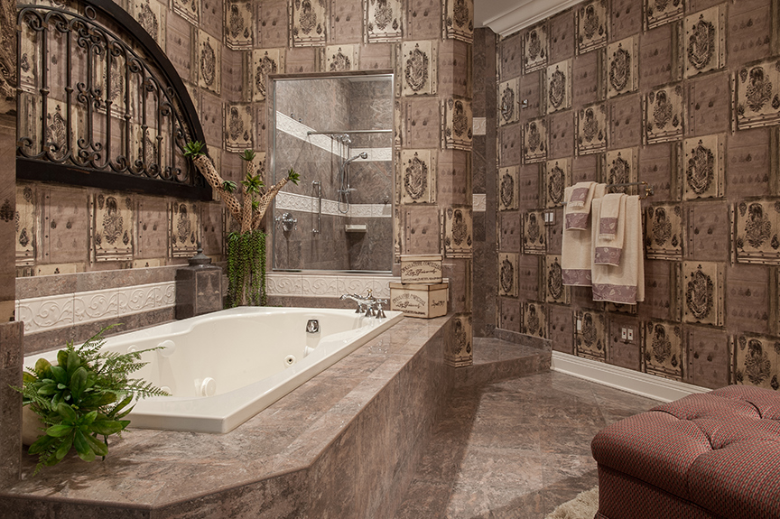 The adjoining master bath continues the color theme with beautiful wallpaper that complements the bedroom. When the home was built in 2002, the homeowners were aggressive in their master bath design, and today, it is still a look they love.