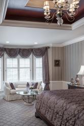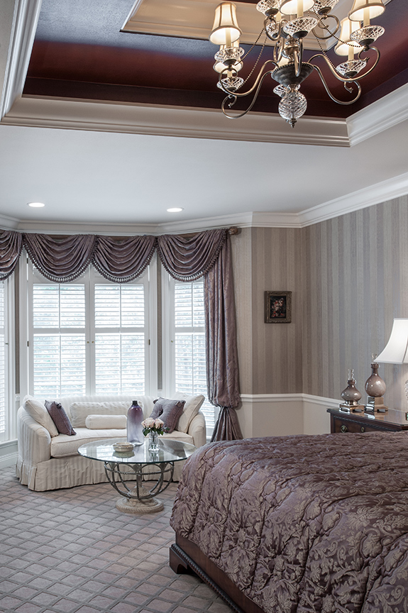Comfort, but also style, was key in the serene master suite, which highlights varying shades of purple, from the aubergine tray ceiling with a metallic sheen, to the soft shades accented in the rug. Painting the tray pulls together the purple hues from the carpet while allowing the beautiful architectural work in the ceiling to shine.