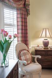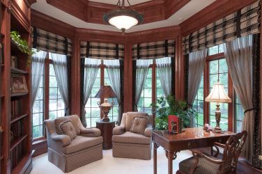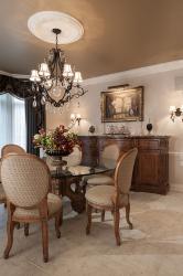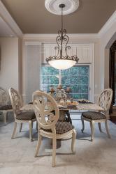 Off the great room, the breakfast area and kitchen had minimal, but still worthwhile updates. The breakfast-room ceiling was painted a darker taupe to contrast the more neutral walls. Window treatments bring a refreshing dose of color and warmth against the wall color and dining ensemble.
