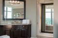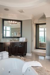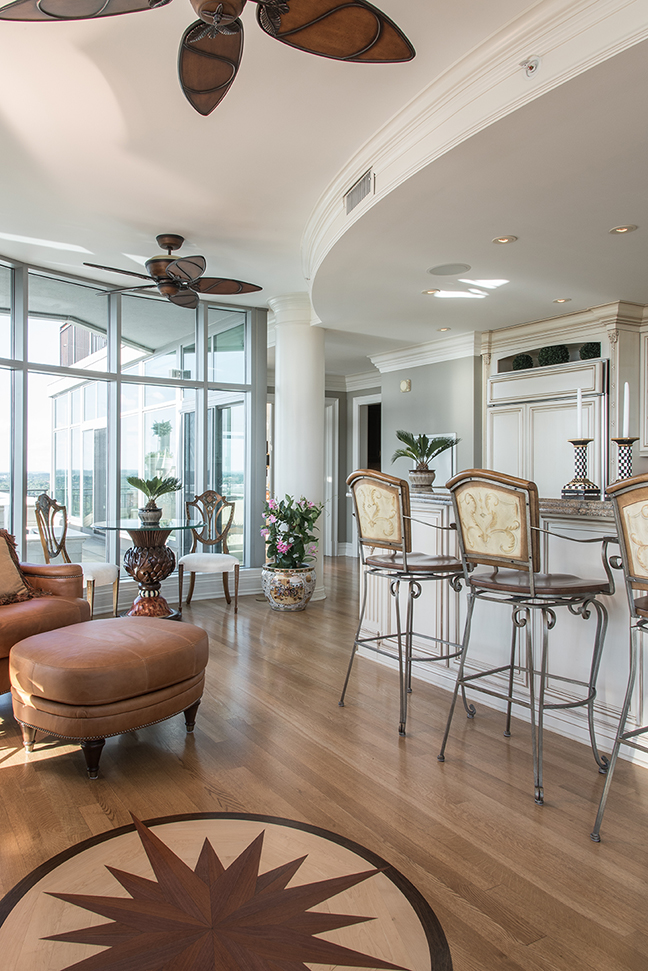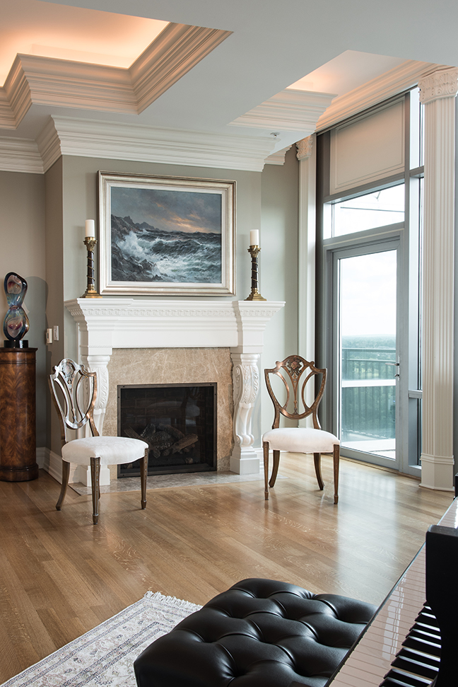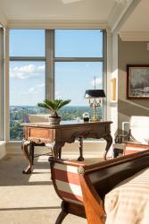 Although privacy is hardly an issue at this height, the bedroom windows, like all of the windows throughout the home, were fitted with automated privacy shade systems by The Sound Room, who also installed the whole-house sound system. Always attentive to detail, Hackett concealed the shade tracks in the owner’s suite with classic columnar wood trim.