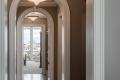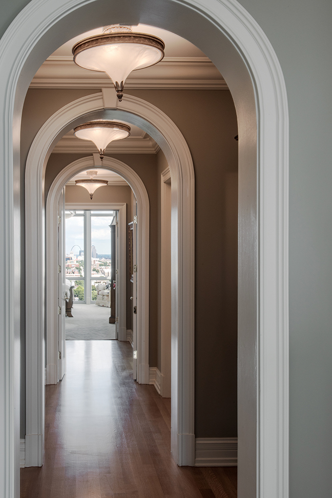 Unique ceiling fixtures light an arched hallway leading to the sun-filled suite reserved for the owner’s mother, a spritely nonagenarian who thoroughly enjoys her magnificent view of the Arch to the east. The hall also illustrates Hackett’s ingenuity, with tall, picture-framed mirror panels concealing access to the home’s mechanical equipment.