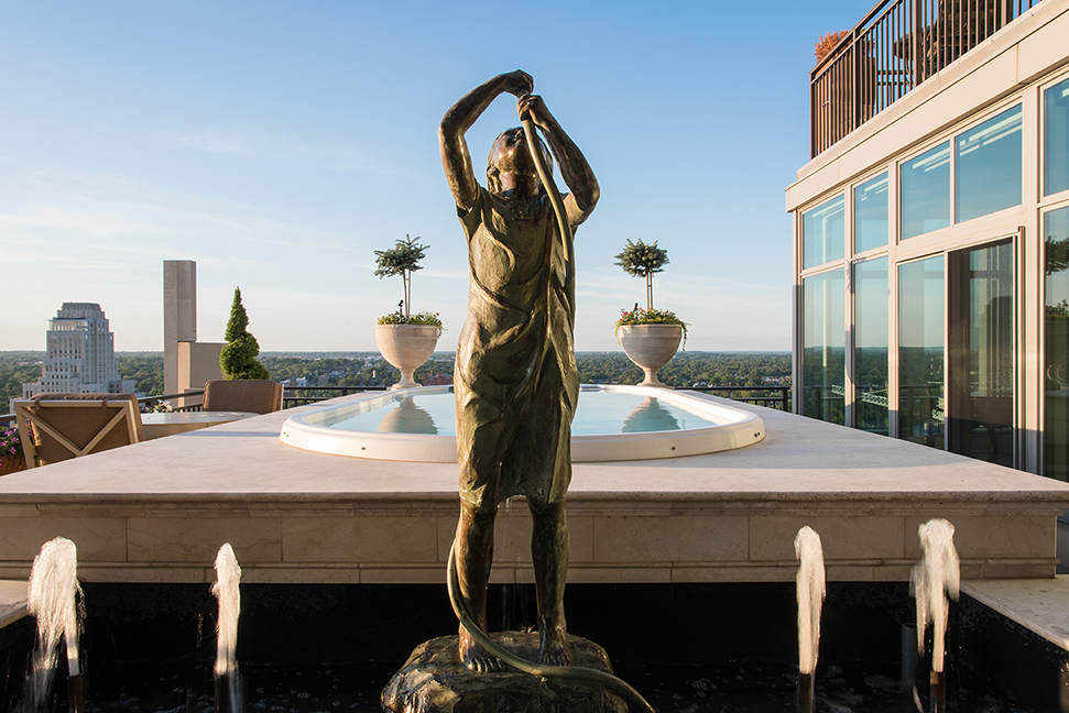 The home’s pièce de résistance, however, is the massive, multilevel terrace overlooking Forest Park to the west. At the north end is a bilevel Dimension One swim spa and fountain, designed by Bavolek and encased in marble by Hackett. Splashing water into a subtly lit pool, the fountain is a charming bronze sculpture by Corinne Hartley.