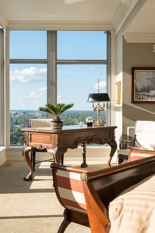 The owner’s choice of Hackett was never in question. The two met in the early 1990s. Hackett worked on and built two of the owner’s former homes and, over the years, their respective families have become close friends. On hand for the tour, Hackett described his client as having “really good visions,” adding that much of the interior décor for the new condominium was designed to recreate the elegant traditional styling of the owner’s previous home in Ladue.