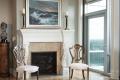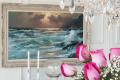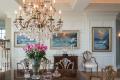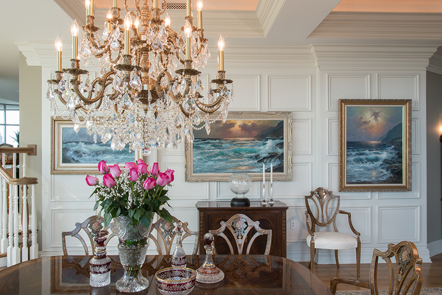 The dining area showcases a large crystal pendant chandelier, suspended above an exquisite crotch-mahogany table from the Heritage Heirloom Collection. Inlaid with a border of ribbon-striped mahogany, the table is surrounded by hand-painted fruitwood dining chairs, and additional seascapes – two by the senior Dzigurski, another by his son, Alexander II – are displayed on the interior wall.