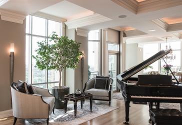 As intended, the condominium’s ambience is dominated by its expansive window walls and breathtaking views. High ceilings enhance the sense of volume, and taupe-toned walls and quarter-sawn white-oak flooring establish a neutral background for the dramatic architectural elements and the owner’s classic furnishings and original artwork.