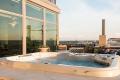 Returning to the dining area, a short flight of steps leads up to the family-room level, where a curved floor-to-ceiling window wall integrates the space with the expansive open-air terrace. A compass symbol, embedded in the floor, is a reminder of the multidirectional views, and a saddle-colored leather sofa with curved back fits perfectly into the rounded nook. Set against one window is another clever Hackett innovation – a large, dual-screen TV lift cabinet, handsomely crafted and viewable from both the family room and the outdoor hot tub.