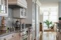 Open to the family room, the spacious kitchen also exhibits the builder’s fine craftsmanship. Corbels carved with Corinthian acanthus leaves support the 15-foot island, and Junipero del Classico countertops from Brazil complement the cream-colored, umber-glazed cabinetry, Amerock brass hardware and custom range hood. Two dishwashers and an icemaker were of special importance to the owner, since he entertains frequently, and other state-of-the-art appliances include two Wolf ovens (one in the butler’s pantry) and a Sharp cabinet-drawer microwave.