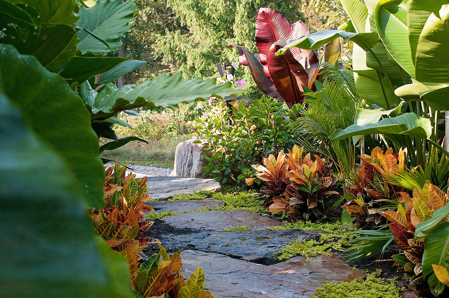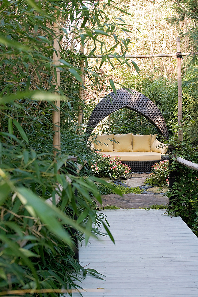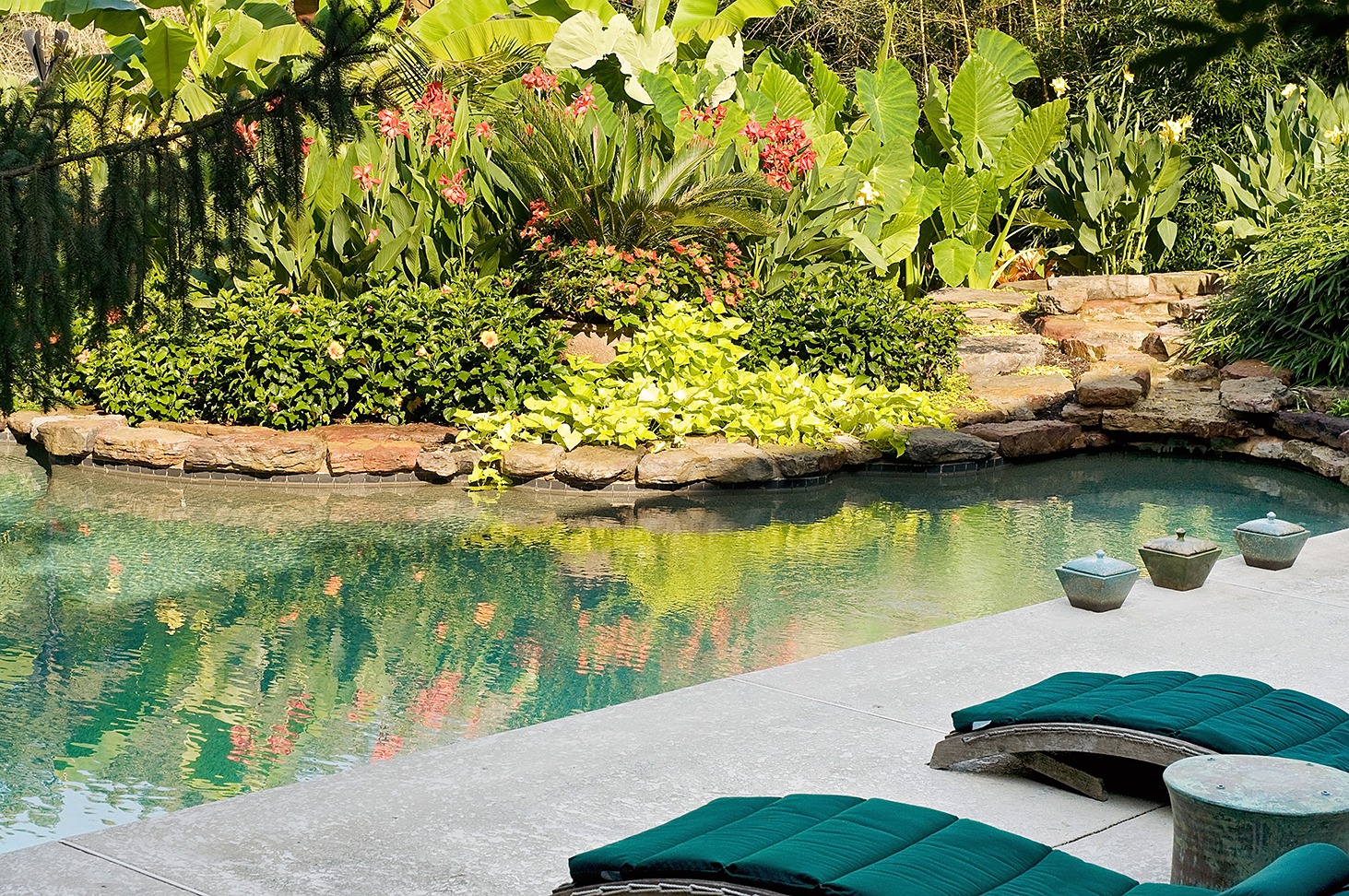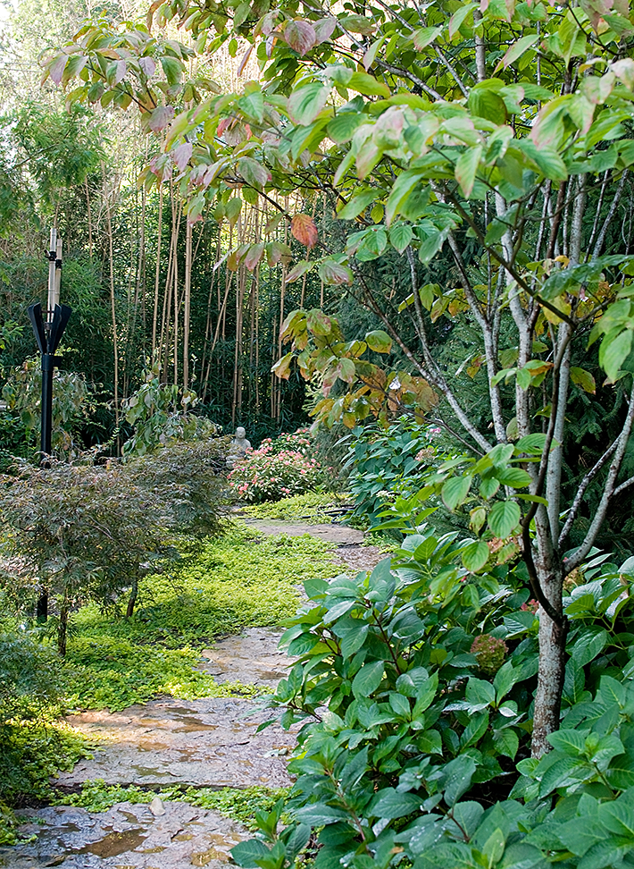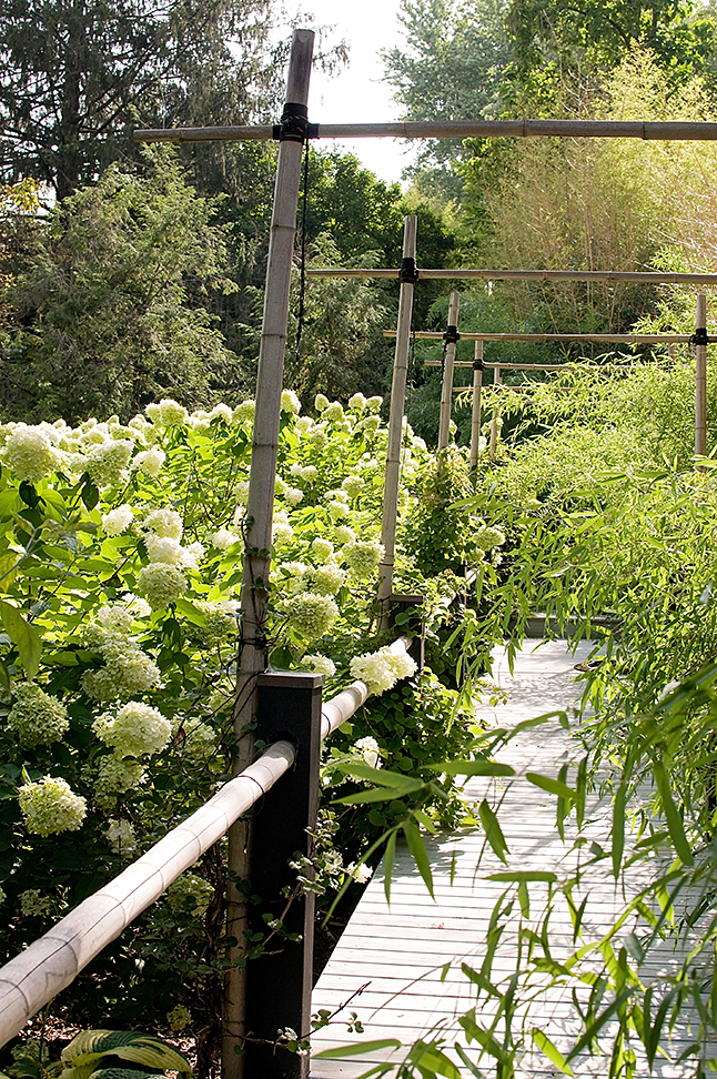 There was, she recounts, one particular “aha” moment when her vision took shape as she was sitting by the pool, having her morning coffee and staring at the blank canvas that eventually was to become her inspiring landscape. With a spatial feel from years of working in real estate, not a background in design or horticulture, Melissa began to envision a tableau with the center of the yard as an ocean with ever-moving grasses simulating waves. The borders of the yard would transport visitors on a journey through an exotic, spa-like landscape composed of mystical, bamboo-lined walkways, hydrangea tunnels, dawn redwood-framed tree houses and tropical islands. Knowing what she wanted and making it happen required her to be totally involved. “I couldn’t draw it so I had to be out there every step of the way,” she emphasizes.