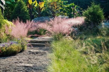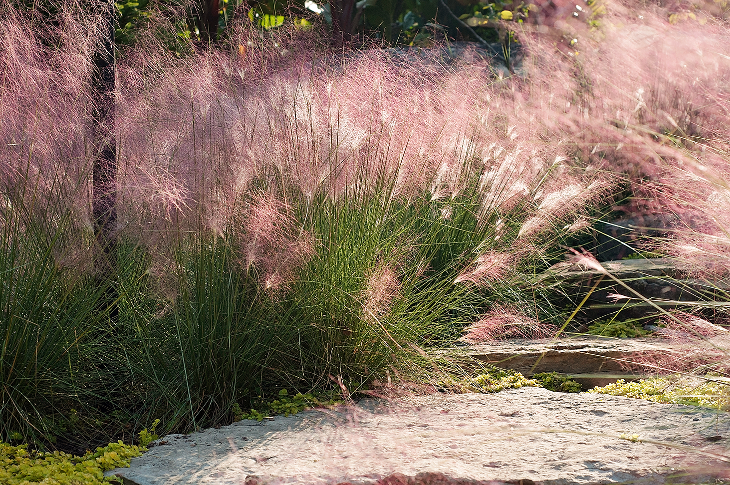 Perhaps her favorite time to view the results of her inspiration is in the early fall. That is when the knee-high clumps of muhly grass that edge the dropseed ocean send up fuchsia blossoms that appear as hot-pink ocean spray alongside the gray-green “water.” “It’s the prettiest thing I have ever seen,” she says of her vision.