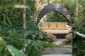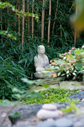 One plant Melissa did not have to purchase was the bamboo that moved from a neighbor’s yard into hers. The lacey texture and continually rustling evergreen foliage fit in perfectly with her vision for the garden. She has learned to curb its invasive tendencies by installing a barrier three-feet deep and at least two inches above ground that so far has kept the bamboo just where she wants it.