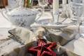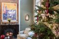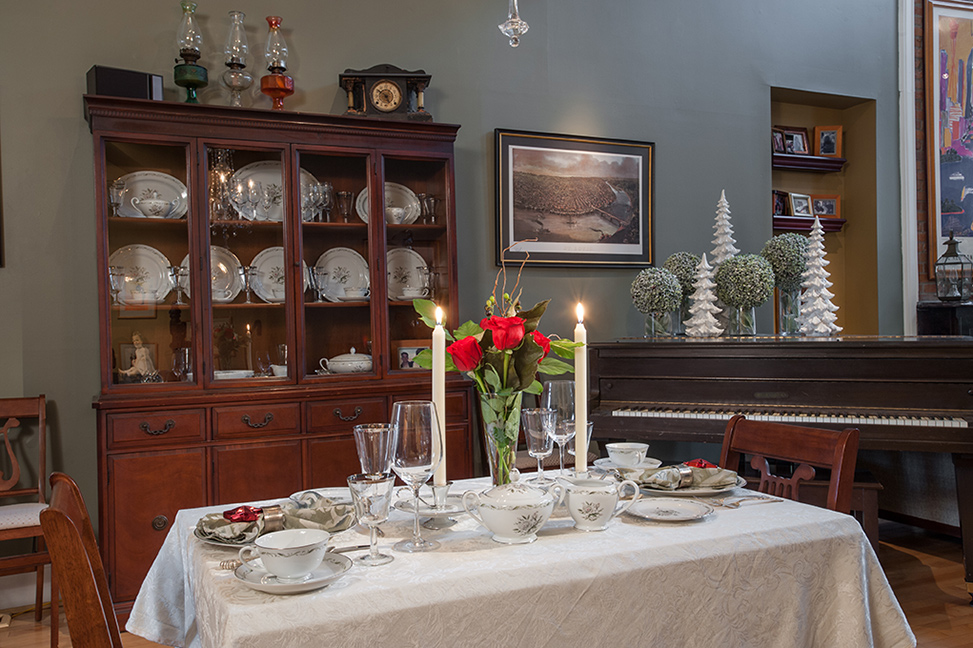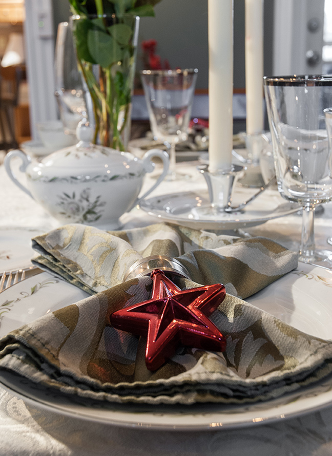 Included in the main living area, the dining room continues the subtle approach to the seasonal décor. The table is exquisitely set for two with fine china topped with a single red star, which is a nod to the Soulard star found on the exterior of all the buildings in the area. On the piano, botanical balls set in clear glass vases are positioned next to shimmering trees. The display brings a modern approach to the otherwise traditional décor, which is a prime example of how the homeowners mix old with new.