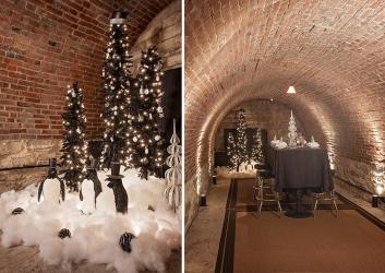 Used in the 1900s to store ice, today the grotto serves as a bonus entertainment space that is always a conversation starter. The intimate gathering place is a quaint spot for small dinner or cocktail parties. The architectural interest of the curved brick ceiling provides enough interest that holiday décor in the space didn’t need to be over the top. In the back left corner, a snowy setting with friendly-lighted penguins and trees represents the ice that used to be stored in the space.