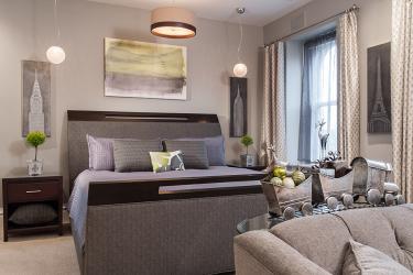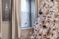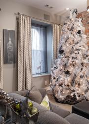 Soft-gray tones, plush fabrics and prints of iconic architectural buildings combine for a contemporary calm space. Understated holiday decorations add just the right amount of jolly to the master suite. A metal train set filled with silver and green ornaments chugs across a console table, while in the sitting area a white tree decked in feathers, masks and glitz and glam pays homage to the holiday Soulard is best known for… Mardi Gras.