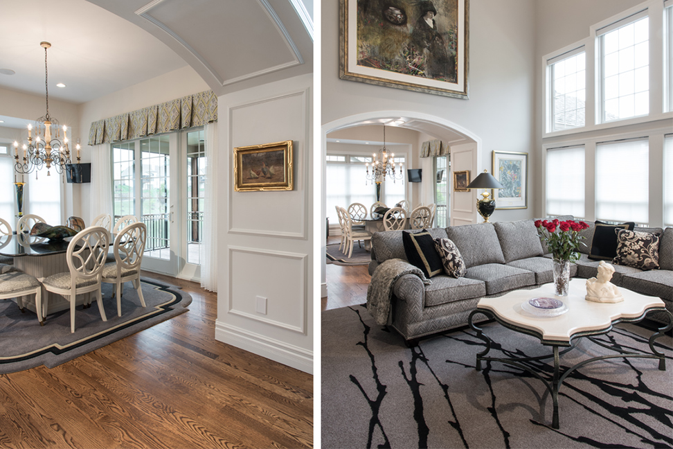 Starting in the entry foyer, job-finished oak-select flooring blankets much of the home’s main level. Here, Pepper custom designed square pillars to define the open formal dining room and to showcase several sculptures, and the main hall was modified to accommodate a treasured buffet.