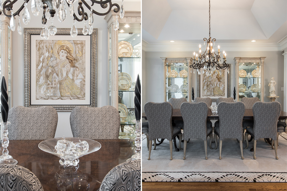 Dominating the dining room is a magnificent walnut/ebony/mahogany table, surrounded by dining chairs and a limestone-topped oak buffet from E.J. Victor. An ethereal Lorella painting hangs between two classical, lighted china cabinets in an antique white wash, and decorative accents include considerable Steuben glass and antique statuary and pedestals from the World’s Fair.