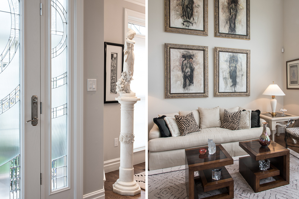 The great room’s display niches were custom designed for specific pieces, and abundant artwork adds color to this elegant gathering space. Above the mantel is a Richard Hall painting. On the opposing wall, the arch to the breakfast room is surrounded by another Hall painting and two Chagalls. Other noteworthy pieces include a Picasso, Lichtenstein’s “Cathedral,” Murano figurines and Steuben and Lalique birds.