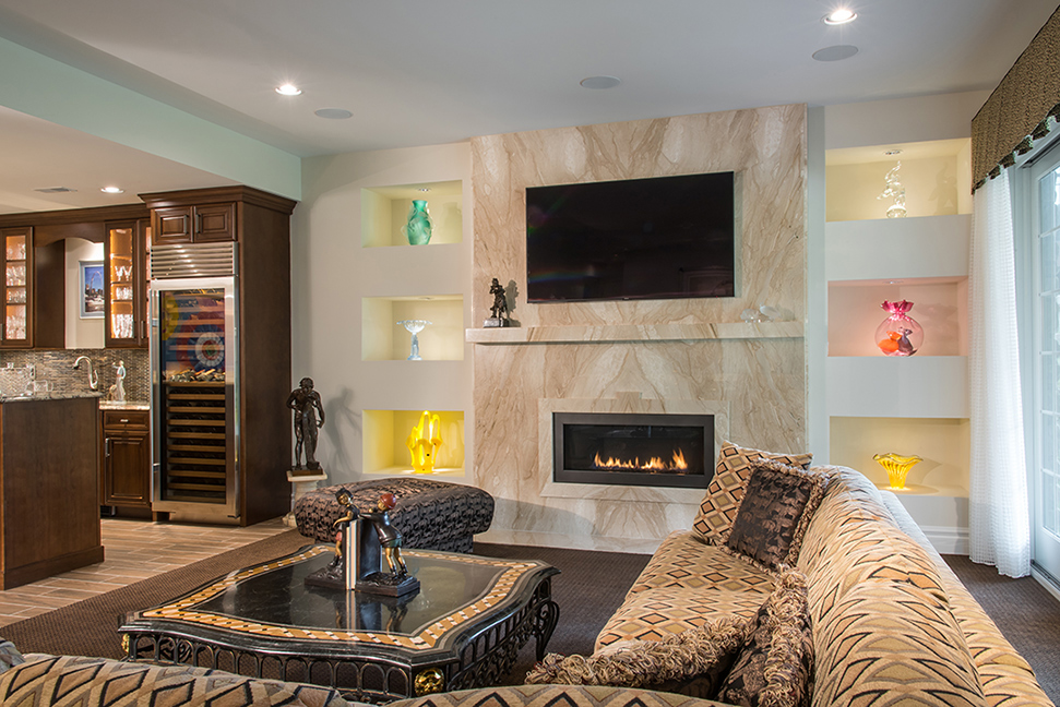 On the walkout lower level, Pepper chose a “mix of traditional and contemporary styles” for a relaxed, comfortable ambience in the vast entertainment area. Book-matched marble slabs encase the linear fireplace, which is flanked by lighted custom niches. Granite countertops and wicker/bamboo/leather bar chairs add glamour to the fully equipped wet bar. A traditional game table is juxtaposed with an intriguing cabinet by Richard Hall; plush seating is arranged around a Maitland-Smith coffee table; and of course, an array of fine art, including an original Trova, is displayed everywhere.