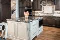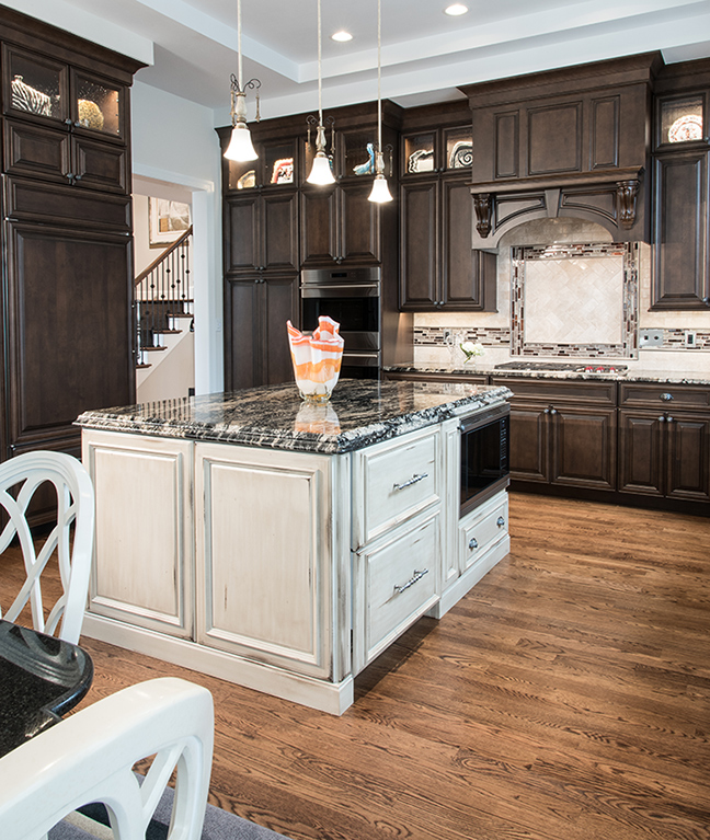 In the kitchen, the soffit was lowered, establishing a floor-to-ceiling effect for the rich, distressed-walnut Beck/Allen cabinetry and built-in Sub-Zero and Wolf appliances. Double ogee granite tops the hand-rubbed/scraped island with its English white finish, and Pepper created the bold wall-tile design, which ties the elements together.