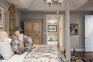 Virtually all of the luxurious furnishings in the master bedroom came from the owners’ former home, but Pepper transformed the suite into a spa-like retreat with a spectacular, custom-designed bath featuring a heated Carrera marble tile floor, zero-entry all-glass shower and floating-air tub.