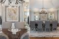 In a major structural change, Pepper reconfigured the breakfast room, moving the bay from the back of the villa to the side and providing access to a spacious rear deck that overlooks the lake. Open to the kitchen, the breakfast room combines a previously owned black absolute granite table with Century chairs, an area rug geometrically scalloped to emulate the table’s custom shape and a chandelier designed to match the pendant lights suspended over the kitchen island.