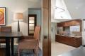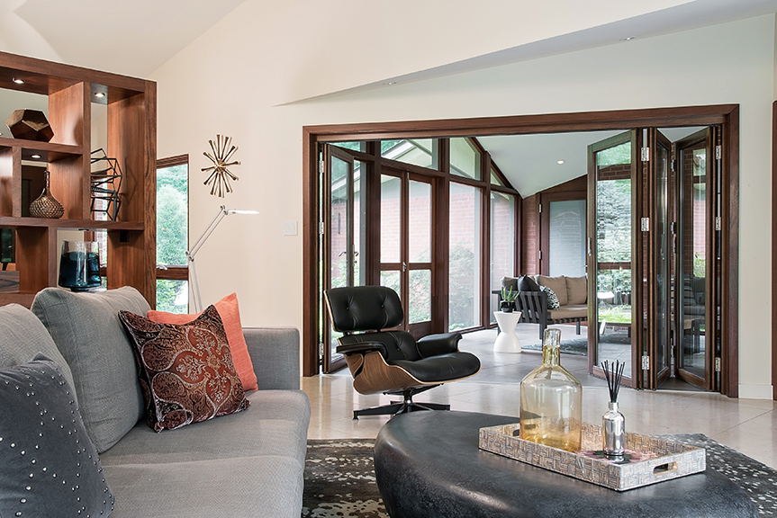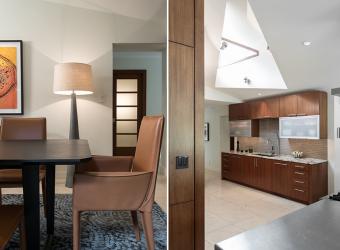 A dramatic NanaWall folding glass door system, opening to the three-season room, separates the lounge from the vaulted formal dining room. Adjoined by a temperature-controlled wine room, the dining room is centered by a faceted gray oak table. Saddle-colored leather dining chairs lend an earthy tone, and a silk/wool-blend rug in a fossil-like texture reinforces the room’s “natural” ambience.