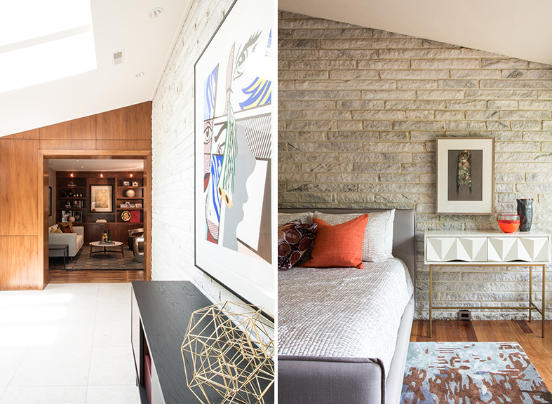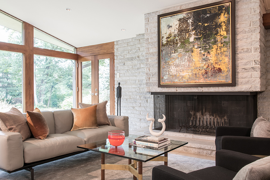 “We chose the furniture to support the artwork,” she explains. “With so many windows, wall space was limited, and determining locations for the art pieces came first. Because of the wide-open layout, we also needed to create separate living areas, while maintaining a continuous flow from one to another.”