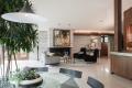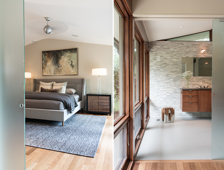 Adjacent to the gathering space is a casual dining area, consisting of a chrome-and-glass Knoll Platner table surrounded by sleek ebony Saya chairs and lit by an unobtrusive Scandinavian pendant fixture. “Working with Niche gave me access to various commercial sources, and the simplicity of these pieces creates a nice interplay with the outdoors,” the designer remarks.