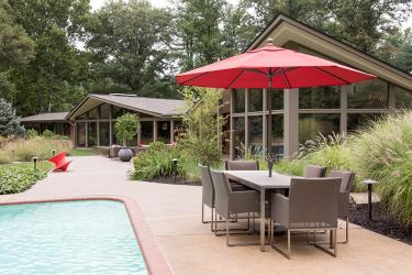 Originally designed by St. Louis architect Frank McGuire, the single-level, 1950s-vintage residence typified mid-century styling – linear, functional and free-flowing, with varied ceiling heights and vast expanses of glass integrating the house with its lush surroundings. A three-year rebuild project, completed in 2010 for the former owners, had added a pool/guest house wing and brought the windows, systems, and interior elements up to date, while carefully preserving the home’s architectural integrity.