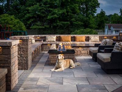 Outdoor fire pit, by Belgard. Warm hues and stonelike textures create a welcoming atmosphere for this stunning fire pit outdoor living room. Rich, variegated colors and textures allow the Verona...