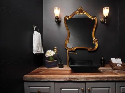 Let your powder room pack a punch with black walls. Whether painted or plastered in a pretty paper, walls in the color black make a bold, dramatic statement in a small space.