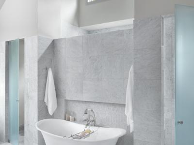Castle Design and Marc Christian Fine Cabinetry worked together to take a 91-square-foot primary bathroom down to the studs. The goal was to create a fresh, open and restful space in the 80-year-...