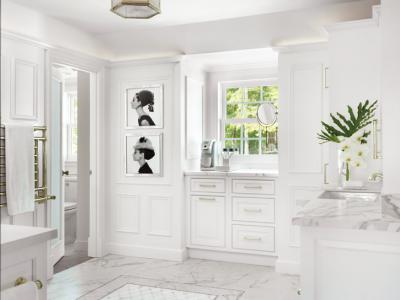 This elegant master bath designed by Alspaugh Kitchen and Bath uses painted molding mounted on the wall to emulate wall paneling. Combined with matching painted beaded inset cabinetry, the entire...