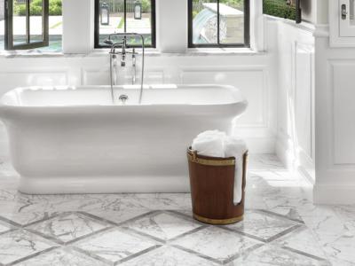 A leaking toilet from a second-floor bathroom provided the perfect opportunity for a master bath redesign led by Alspaugh Kitchen and Bath. The dramatic Calacatta Michelangelo marble became the...